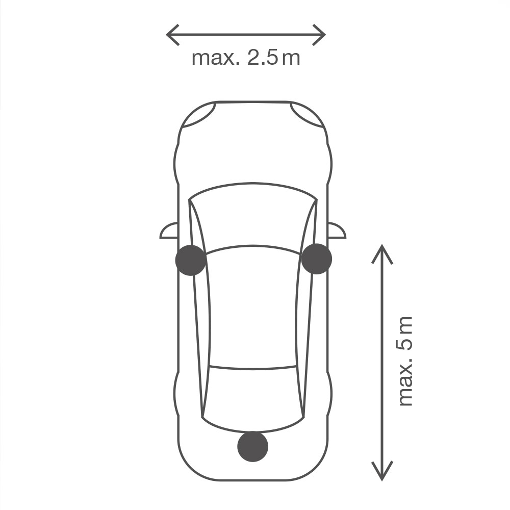 Platzieren Sie einen der drei Car-Converter (Zylinder) vorne links, im Türbereich direkt neben dem Fahrersitz und den zweiten Car-Converter vorne rechts, im Türbereich direkt neben dem Beifahrersitz. Der dritte Car-Converter sollte hinten im Bereich des Kofferraums möglichst mittig platziert werden. Wichtig: Achten Sie darauf, dass der Abstand zwischen den beiden Car-Convertern vorne links und rechts max. 2,5 m beträgt und der Abstand zwischen dem hinteren Car-Converter und den beiden vorderen Convertern max. 5 m beträgt. Dieser Abstand sollte nicht überschritten werden. Bei Fahrzeugen über 5 m (Bus, Zug, Flugzeug usw.) können mehrere Car-Converter in Serie hintereinander verwendet werden.